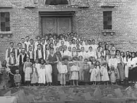 “Fiii satului”, 29 iunie 1980. Dascăli și pionieri în fața școlii din Marin