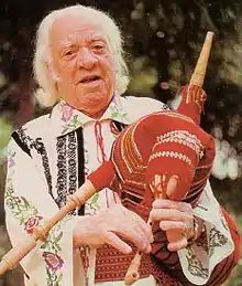 ![]() Marin Chisăr în postura de cimpoier (1994). | |