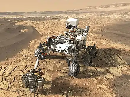 ![]() Roverul Perseverance pe pământ marțian (concept artistic) | |