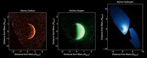 Marte și-a pierdut magnetosfera în urmă cu 4 miliarde de ani,[83] probabil din cauza numeroaselor impacte cu asteroizi,[84] astfel încât vântul solar interacționează direct cu ionosfera marțiană, scăzând densitatea atmosferică prin eliminarea atomilor din stratul exterior. Atât sonda Mars Global Surveyor cât și Mars Express au detectat particule atmosferice ionizate care scapă în spațiu în urma planetei Marte,[83][85] și această pierdere atmosferică este studiată de către orbitatorul MAVEN. Față de Pământ, atmosfera lui Marte este foarte subțire. Presiunea atmosferică variază de la un nivel scăzut de 30 Pa pe Muntele Olimp la peste 1.155 Pa în Hellas Planitia, cu o presiune medie la nivelul suprafeței de 600 Pa.[86] Pe Pământ, o astfel de presiune se găsește la o altitudine de 35 km deasupra suprafeței mării.[87] Presiunea medie de suprafață este de doar 0,6% din cea a Pământului. Presiunea în atmosfera lui Marte scade cu altitudinea mai lent decât pe Pământ, scăderea relativă apare aproximativ la fiecare 10,8 km (pe Pământ la aproximativ fiecare 6 km).[88] Acest lucru se datorează accelerației gravitaționale mult mai reduse pe suprafața planetei Marte (aproximativ 38% din cea a Pământului).