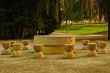 ![]() În prim plan, Masa tăcerii, în plan îndepărtat, Poarta sărutului, ambele în parcul orașului de pe malul Jiului | |