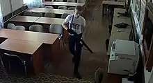 ![]() Roslyakov în magazinul de arme Sokol, patru zile înaintea masacrului. | |
