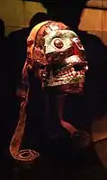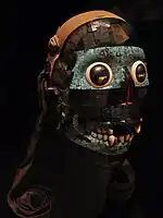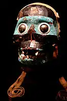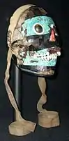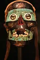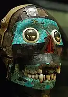 Pe acest craniu uman au fost executate benzi de mozaicuri de turcoaz albastru și lignit negru. Ochii măștii sunt realizați din pirită și scoică, nasul fiind făcut tot dintr-o scoică.
