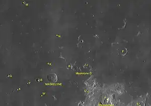 Prin convenție, craterele vecine sunt identificate pe hărțile lunare prin plasarea de litere alături de numele craterului central, în acest caz Maskelyne.