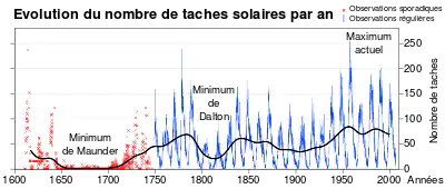 Istoric al numărului de pete solare observate, care arată recenta creștere a activității solare.