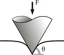 În cazul indentării unui semi-spațiu elastic cu un indenter conic, adâncimea și raza zonei de contact sunt date de relația: