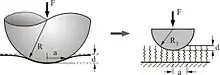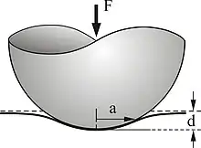 În cazul unei sfere elastice de raza presată până la adâncimea într-un semi-spațiu elastic, se formează o suprafață de contact de raza . Forța necesară este:
