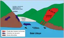 La 10 iulie 1958, un cutremur lovește munții din jurul golfului și provoacă o alunecare de teren pe flancul de vest al unuia dintre ei[1]. Mase de rocă se prăvălesc în golf, mai precis în Gilbert Inlet, creând o undă de șoc care dă naștere unui tsunami. Valul înaintează în aceeași direcție ca și alunecărea de teren, dar s-a lovit de muntele de la malul opus al golfului. În această etapă, încă posedă toată energia. Masa imensă de apă se ridică de-a lungul pantei și smulge vegetația din apropierea de țărm și rade solul până la roca de bază: