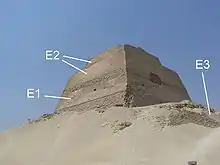 Intrarea în piramida se face pe partea de nord, la 18,5 metri deasupra nivelului solului: o dată pe ușa din față, un coridor înclinat duce spre camera mormântului, dar fără un sarcofag.