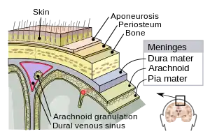 Straturile meningelui (sunt reprezentate și osul și epiderma)