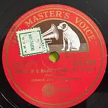 ![]() Label-ul discului His Master's Voice cu Menuetul în sol major (Paderewski) | |||||