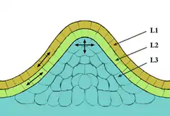 Există două tipuri de meristeme apicale (vârfuri vegetative), acestea fiind conul rădăcinii și al tulpinii. Spre deosebire de tulpină, la rădăcină zona meristematică este acoperită de un țesut protector denumit scufie sau caliptră.[1] Numărul straturilor de celule variază în funcție de tipul de plantă. În general, stratul extern este denumit tunica, iar cel intern corpus. La gimnosperme și angiosperme, în conul meristematic se află două, trei sau mai multe grupuri de celule inițiale din care se formează foițele histogene (dermatogen, periblem, plerom) prin diviziuni anticlinale și periclinale.[1] La monocotiledonate, tunica determină caracteristicile fizice ale frunzei și ale marginii foliare. La dicotiledonate, al doilea strat preia acest rol.