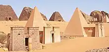 Situl Meroë este marcat de peste două sute de piramide în trei grupuri, dintre care multe sunt în ruine. Au dimensiunea și proporțiile distinctive ale piramidelor nubiene.