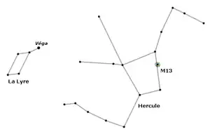 Căutarea este foarte ușoară. Constelația Hercule formează un trapez: dacă se plasează cu latura mare în sus, roiul M13 se găsește pe partea dreaptă a trapezului, la circa o treime din înălțime (pornind din colțul superior drept).