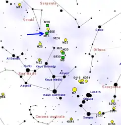 Nebuloasa a fost menționată de De Chéseaux în 1746, apoi de Messier în 1764. Este vizibilă cu ochiul liber în bune condiții la latitudini joase, cu magnitudinea aparentă 6. Prin luminozitatea sa, M17 este ușor de reperat: se situează la 2° la sud-vest de steaua Gamma din constelația Scutul (Gamma Scuti).