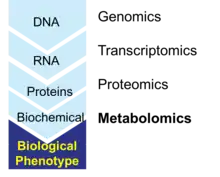 Metabolomica este un domeniu științific care se ocupă cu studiul proceselor chimice care includ metaboliții, moleculele mici care acționează ca substrat, intermediari de reacție și produși ai metabolismului celular. În mod specific, metabolomica este „studiul sistematic al amprentelor chimice unice pe care procesele celulare specifice le lasă” și studiul profilului metaboliților, ca molecule de dimensiune mică.[1] Metabolomul reprezintă totalitatea metaboliților dintr-o celulă, țesut, organ sau organism, aceștia fiind produșii finali ai proceselor celulare.[2] Analiza ARN-ului mesager (ARNm), datelor legate de expresia genelor și proteomica scot la iveală un set de produși genetici celulari. În schimb, profilul metabolic are rolul de a indica o vedere de ansamblu instantanee asupra fiziologiei celulare,[3] și astfel metabolomica prezintă în mod direct starea fiziologică a unui organism.[4] Există metode de corelații cuantificabile între metabolom și alte structuri celulare (genom, transcriptom, proteom și lipidom), iar acestea pot fi utilizate pentru a prezice răspândirea metaboliților în probe biologice, de exemplu abundența ARNm.[5]