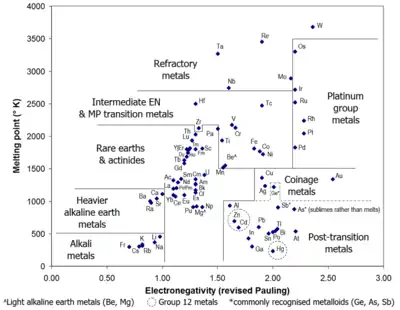 Metalele de post-tranziție se disting printr-o valoare relativ ridicată a electronegativității și puncte de topire relativ scăzute.