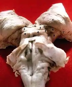 ![]() Secțiune prin creierul uman (inferioro-posterioară): 1 - pulvinarul talamic; 2 - coliculi superiori; 3 - ramurile coliculilor superiori; 4 - coliculi inferori; 5 - ramurile coliculilor inferiori; 6 - corp geniculat medial; 7 - corp geniculat lateral; 8 - creasta cerebrală | |