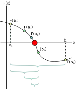 Valoarea funcției la mijlocul intervalului: . Deoarece este negativ, este înlocuit cu pentru următoarea iterație, pentru a respecta condiția ca și să aibă semne opuse. După un număr finit de pași, intervalul va avea lățimea tinzând spre 0, iar valorile funcției în acest interval vor converge spre rădăcina funcției. În tabelul următor se poate observa evoluția funcției.