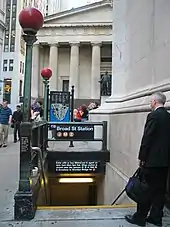 În partea de sus a intrării în stație au fost montați stâlpi (unul sau doi) care susțin lămpi (una sau două) colorate și de formă sferică. Înainte de introducerea MetroCard-ului în 1994, aceste lumini indicau valabilitatea stației. Dacă lumina era verde, însemna că stația era deschisă și intrarea la metrou era posibilă 24 de ore. Dacă lumina era galbenă, însemna că stația era deschisă numai pe timpul zilei. O lampă de culoare roșie indica faptul că intrarea nu era posibilă, întrucât deschiderea funcționa numai ca ieșire. S-a renunțat într-un final la lămpile galbene care au fost înlocuite cu lămpi roșii. Astăzi sistemul are următoarele semnificații: lămpile verzi arată că intrarea funcționează 24 de ore pe zi, iar lămpile roșii, că intrarea nu funcționează 24 de ore pe zi.[18]