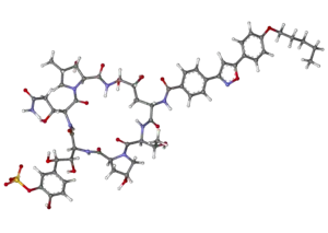 | SMILES | CCCCCOC1=CC=C(C=C1)C2=CC(=NO2)C3=CC=C(C=C3)C(=O)NC4CC(C(NC(=O)C5C(C(CN5C(=O)C(NC(=O)C(NC(=O)C6CC(CN6C(=O)C(NC4=O)C(C)O)O)C(C(C7=CC(=C(C=C7)O)OS(=O)(=O)O)O)O)C(CC(=O)N)O)C)O)O)O[2] |