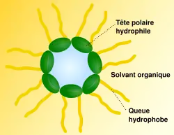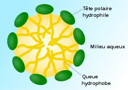 - La o anumită concentrație numită CMC (Concentrația Critică Micelară) agenți tensioactivi sunt formați din micele directe. Acestea sunt sfere a căror mărime este definită de natura agentului tensioactiv cu extremitățile hidrofile spre exterior, spre solvent, și cozile lipofile grupate în interior.