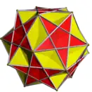 În fiecare vârf se întâlnesc câte douăsprezece fețe: câte trei triunghiuri și trei pentagrame, care formează fațetele triunghiulare externe, și câte șase pătrate, care formează fețele interne. Poate fi construit din marele icosaedru prin cantelare.