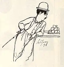 ![]() Caricatură cu Charlie Chaplin ca Micul vagabond, 1921 | |