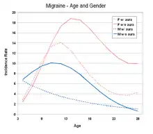 Declanșatorii comuni sunt stresul, foamea și oboseala (aceștia contribuie în mod egal la cefaleea tensională).[40] Migrenele au loc mai degrabă în preajma menstruației.[42] Alte influențe hormonale, cum ar fi menarha, utilizarea contraceptivelor orale, sarcina, perimenopauza și menopauza joacă, de asemenea, un rol.[43] Se pare că aceste influențe hormonale joacă un rol mai important în cazul migrenelor fără aură.[44] De obicei migrenele nu au loc în timpul celui de-al al doilea și al treilea trimestru de sarcină sau după menopauză.[19]