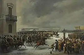 Pe 25 decembrie (stil vechi: 13 decembrie), la 20:00,[119] Nicolae s-a declarat împărat; a doua zi la 7 dimineața, împreună cu toți oamenii de stat superiori prezenți la Sankt Petersburg, Miloradovici a promis loialitatea față de Nicolae[120] (Korf a sugerat că Miloradovici l-a recunoscut pe Nicolae încă din ziua anaterioară[121]). Din nou, Miloradovici l-a asigurat pe Nicolae că orașul este „absolut liniștit”;[111][122] Alexander von Benckendorff a scris că acesta se află în obișnuita lui dispoziție optimistă.[123] Trei ore mai târziu, când Miloradovici a luat micul dejun cu Teleshova, generalul Neidhardt i-a raportat lui Nicolae că trupele se îndreptau spre palat.[124]