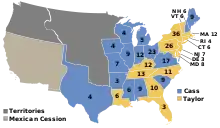 În cele din urmă, candidatura Taylor/Fillmore a câștigat clar, iar voturile electorale din New York au fost din nou esențiale pentru alegeri.[81] Candidatura Whig a câștigat votul popular cu 1.361.393 (47,3%) la 1.223.460 (42,5%) și a triumfat în Colegiul Electoral cu scorul 163-127.[lower-alpha 2] Candidații partidelor mici nu au primit nici un vot electoral[82], dar puterea mișcării anti-sclavie a fost demonstrată de votul pentru Van Buren, care, deși nu a câștigat nici un stat, a obținut 291.501 voturi (10,1%) și a terminat pe locul doi în New York, Vermont și Massachusetts.[83]