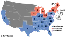 În ziua alegerilor, Buchanan a câștigat cu 1.836.072 voturi (45,3%) și 174 de voturi electorale față de 1.342.345 voturi (33,1%) ale lui Frémont și 114 voturi electorale. Fillmore și Donelson au terminat pe locul al treilea, câștigând 873.053 de voturi (21.6%) și câștigând statul Maryland și cele 8 voturi electorale.[lower-alpha 7] Candidatura Partidului American a pierdut mult în mai multe state sudice și au lipsit doar puțin sub 8.000 de voturi în Louisiana, Kentucky și Tennessee pentru ca alegerea președintelui să fie decisă în Camera Reprezentanților, unde spectrul secesiunii ar fi făcut rezultatul nesigur.[136]