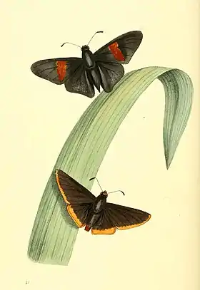| Reprezentare a Mimoniades nurscia de William John Swainson, iar dedesubt este Pyrrhopyge amyclas | |