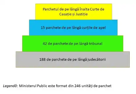 În actuala reglementare privind sistemul judiciar,[6] arhitectura Ministerului Public este reprezentată de o structură piramidală, în vârf fiind situat Parchetul de pe lângă Înalta Curte de Casație și Justiție (a cărui denumire anterioară era Parchetul General). Pe celelalte trei nivele se situează, în ordine descendentă, parchetele de pe lângă curțile de apel (în număr de 15), parchetele de pe lângă tribunale (în număr de 42) și parchetele de pe lângă judecătorii (în număr de 188). În cadrul fiecărui parchet funcționează un colegiu de conducere, iar în funcție de rangul ierarhic și dimensiunea parchetului, conducătorul acestuia poate fi ajutat de unul sau mai mulți adjuncți.