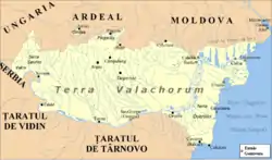 Granițele Valahiei s-au schimbat deseori până la mijlocul secolului al XVI-lea, însă în timpul domniei lui Mircea Țara Românească a ajuns la întinderea teritorială maximă din Evul Mediu: de la Olt în nord la Dunăre în sud și de la Porțile de Fier în vest până la Marea Neagră în est.