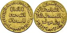 Un dinar de aur al califului omeiad Abd al-Malik, bătut la Damasc, Siria, în Anul Hegirei 75 (697/698), care cântărește aproape un 1 mithqal (4,25 grame)