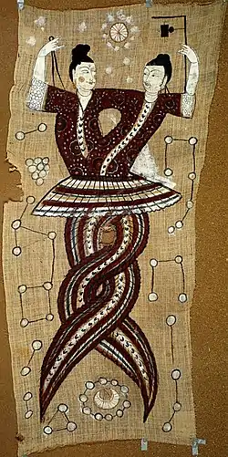 Un al treilea mit îi descrie pe Fu Xi și Nu Wa, două ființe cu trup de dragon, despre care se spune că ar fi frate și soră și care erau reprezentate în iconografie cu cozile înlănțuite. După potop, Nu Wa reface cerul albastru cu pietre de cinci culori diferite, taie picioarele unei țestoase uriașe și înalță patru stâlpi în cei patru poli ai lumii. De asemenea zeița-dragon îl ucide pe Kong Kong (Dragonul Negru). Nu Wa adună cenușă de trestie pentru a opri apele revărsate, apoi modelează oamenii: din noroi pe oamenii săraci, iar din lut galben pe nobili.