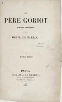 Moș Goriot (în franceză Le Père Goriot) este un roman al lui Honoré de Balzac, început la Saché în anul 1834, unde fusese invitat de familia Margonne să petreacă două luni de odihnă. În realitate, romanul a fost doar schițat la Saché, fiind scris în cea mai mare parte la Paris.[1] Publicarea romanului a început în patru numere din Revue de Paris (decembrie 1834-februarie 1835). Prima ediție a apărut în librării în 2 martie 1835, în două volume, la editorii Edmond Werdet și Charles Vimont. Textul publicat în Revue de Paris era împărțit în părți și capitole. Romanul a intrat în Comedia umană, ediția Furne (tomul IX), în anul 1843 și face parte din ciclul Scene din viața pariziană. Versiunea în limba română a romanului Le père Goriot este datorată scriitorului Cezar Petrescu, a cărui traducere a fost publicată pentru prima dată în 1955, cu titlul Moș Goriot. Traduceri mai vechi ale romanului în limba română au fost: Moș Goriot, trad. de Radu Baltag (= Adrian Corbu), 1909; Moș Goriot, trad. de Haralamb Lecca, 1914.