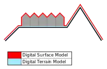 În literatura științifică nu există o utilizare universală a termenilor model digital de elevație (DEM), model digital al terenului (DTM) și model digital al suprafeței (DSM). În cele mai multe cazuri, termenul model digital de suprafață reprezintă suprafața pământului și include toate obiectele de pe ea. Spre deosebire de un DSM, modelul digital al terenului (DTM) reprezintă suprafața liberă a terenului fără obiecte precum plante și clădiri (vezi figura din dreapta). [3] [4]