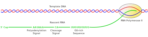 Exemplu de semnal care direcționează procesarea post-transcripție: semnalul eucariotic de poliadenilare direcționează clivarea la primirea semnalului de clivare și adăugarea lanțului poly-A la ARN-ul mesager