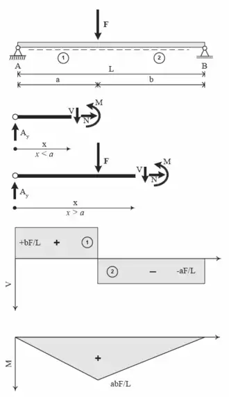 Reacțiunile interne într-o secțiune transversală a elementului structural pot fi reduse la forța și momentul rezultante.[6] Pentru echilibru, momentul creat de forțele/momentele externe trebuie echilibrat de momentul indus de tensiunile interne. Momentul intern rezultat se numește „momentul încovoietor” în timp ce forța internă rezultantă este, convențional, descompusă în componenta coplanară cu secțiunea („forța tăietoare”, transversală pe axa elementului) și componenta perpendiculară pe secțiune („forța normală” sau „forță axială”, de-a lungul axei elementului).