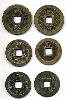 Monede Kan'ei Tsūhō (寛永通宝). Cele de sus valorau fiecare câte 4 mon, cele din mijloc și de jos valorau 1 mon fiecare.