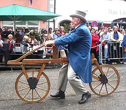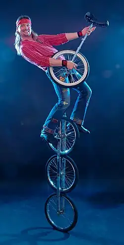 - girafe cu roți: șaua este supraînălțată, iar roata este antrenată de una sau mai multe roți care se ating între ele, stivuite vertical. Un număr par de roți înseamnă că trebuie să pedalezi în direcția opusă rotației roții (record (poate depășit): 13 roți).