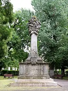 Monumentul a fost realizat din calcar cu granulație mare. Acesta are la bază două trepte de 25 de centimetri înălțime, deasupra cărora este poziționat soclul monumentului. În zona centrală a soclului se ridică o coloană obelisc, care are în partea superioară reprezentări figurative – „Dumnezeu Tatăl și Fiul peste care tronează Duhul Sfânt în formă de porumbel”. Construit după un plan dreptunghiular, pe un postament înconjurat de un pachet de trepte, este plasat obeliscul, de formă piramidală, al cărui capitel este decorat cu o ghirlandă bogată. La baza coloanei se află figura Fecioarei Maria, ornată cu globul pământesc(d) și inscripția „Von der Gemeinde gegründet 1809. Aus Mildtätikeit der Eheleute Josef und Susanne Mohaupt renoviert 1903” (în română: „Ridicată de comunitate în 1809. Renovată în 1903 din generozitatea soților Josef și Susanne Mohaupt”).[2]