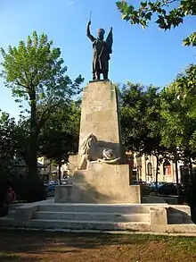 Monumentul lui Tudor Vladimirescu este opera sculptorului român Teodor Burcă. A fost dezvelit în anul 1934. Realizată din bronz statuia are 2,50 metri înălțime și este plasată pe un soclu înalt de 5 metri, placat cu travertin. Statuia îl reprezintă pe Tudor Vladimirescu în picioare, tinând cu mâna dreaptă sabia ridicată deasupra capului și având în mâna stângă un drapel. În partea frontală a soclului este reprezentat un leu.