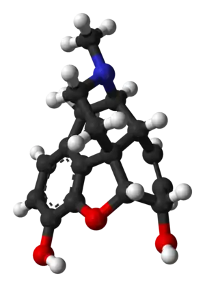 Morfina este un agonist opioid, fiind utilizat ca analgezic puternic.[8][9] Termenul provine de la numele lui Morpheu, zeul visurilor în mitologia greacă.[10][11] Este principalul agent activ din opiu (sub formă de meconat), concentrația sa în extractul de opiu variind între 8 și 14%, cu o medie de 10%. Este un analgezic foarte puternic, face parte din grupa alcaloizilor morfinanici propriu-ziși alături de codeină și tebaină. Căile de administrare disponibile sunt multiple; se poate administra subcutanat, intravenos, intramuscular, intratecal, rectal și oral.[8]