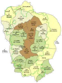 În timpul ultimei revizuiri a statutului său din 2007, parcul natural regional Morvan a realizat o împărțire a teritoriului Morvan pentru a obține 4 grupuri mari, subdivizate în 23 de entități peisagistice: