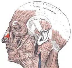 | Acțiune | Comprimă puntea, deprimă vârful nasului, ridică colțurile nărilor |