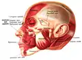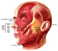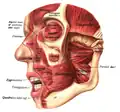 ![]() Mușchii capului, feței și gâtului. (Nazalis etichetat la centru stânga.) | |