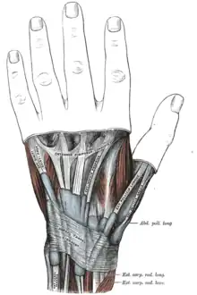 Corpul muscular se continuă în jos cu un tendon lung, care trece pe sub retinaculul extensorilor (Retinaculum musculorum extensorum) printr-o culisă specială, apoi merge de-a lungul celui de-al V-lea metacarpian